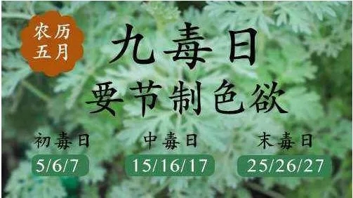 農(nóng)歷五月的初五(端午節(jié))、初六、初七,還有十五、十六、十七,以及二十五、二十六、二十七,這九天被稱為“九毒日”;加上“十四”這天的天地交泰日,一共十天!這十天內(nèi),務(wù)必端容肅己,嚴禁殺生、行淫、同房,否則嚴重傷身、損氣、耗精元,非藥餌能補。