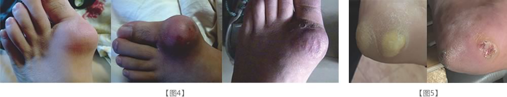 接受抗風(fēng)竤治療的部分痛風(fēng)患者在出現(xiàn)紅、腫、熱、痛、發(fā)燒等無菌性炎癥反應(yīng)之后,痛風(fēng)石隨之會出現(xiàn)明顯變軟、縮小的情,部分患者出現(xiàn)痛風(fēng)石表皮積液甚至尿酸鹽從腳部和手部直接排出的現(xiàn)象【見圖4、圖5】。還有一種情況,某些患者關(guān)節(jié)四肢表面原本沒有痛風(fēng)石,接受抗風(fēng)竤治療 后卻在腳背或者手背鼓起軟包。這是由于關(guān)節(jié)腔內(nèi)的尿酸鹽結(jié)晶快速溶解但未能及時排出引起的,堅持治療幾天后就會代謝排出體外,不必?fù)?dān)心。